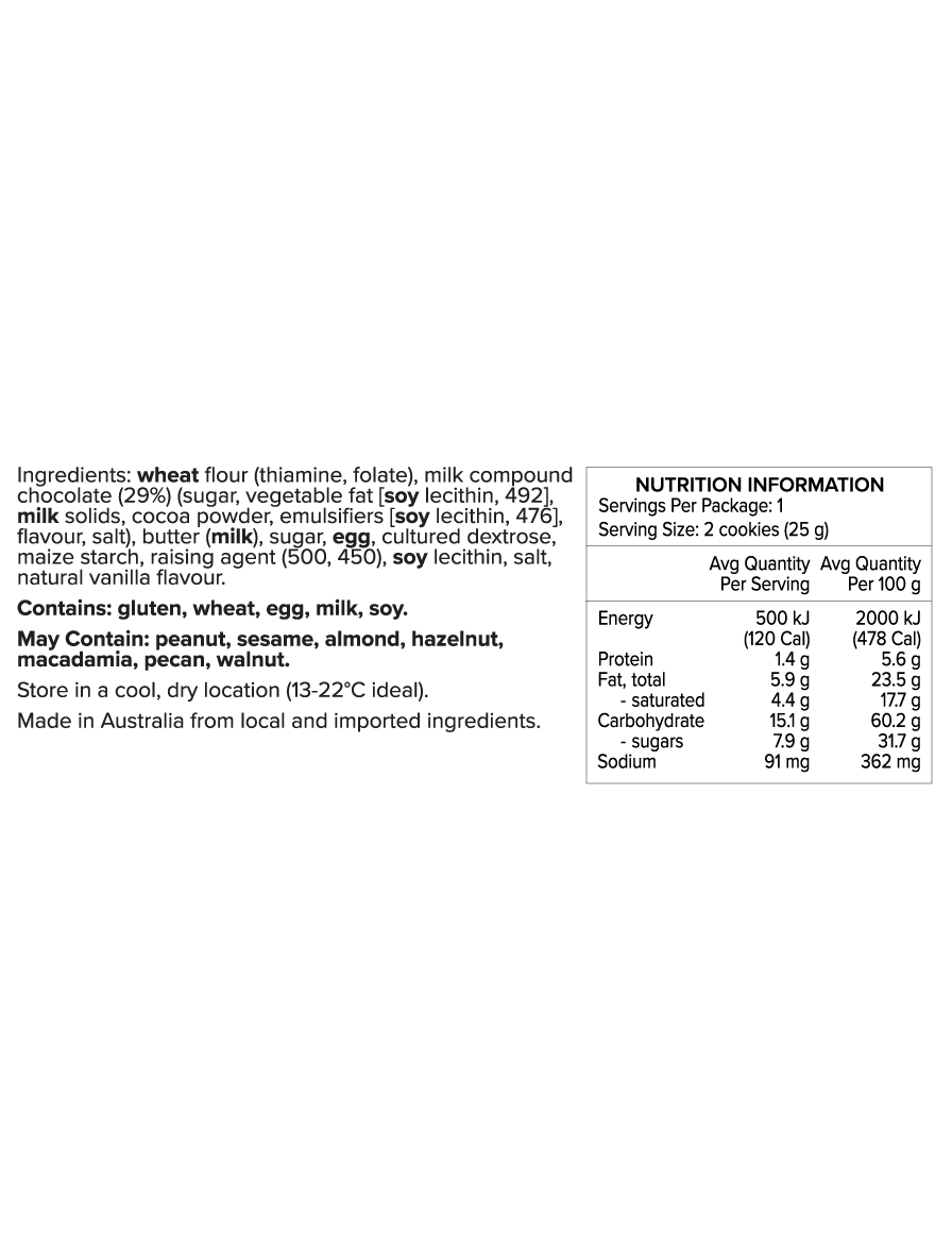 Each delectable Byron Bay Cookie Twin Pack contains 2 x 12.5g cookie bites, perfect if you're looking to sample a new cookie flavour, up your lunchbox game or simply revel in pure snacking indulgence. Can't get enough of our cookie bite twin packs? Also available in cartons of 100 x 25g twin packs for occasions when you need to feed a lot of cookie lovers!